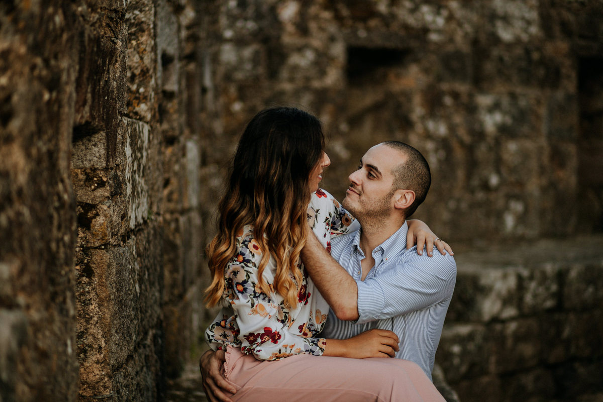 [EN] Bárbara and João are from Santa Maria da Feira. So, at their request, we started the engagement session at the castle. This castle is an icon to the city, to the Portuguese Medieval Architecture and also to the couple. And sincerely, we couldn't ask for more. The rustic and medieval atmosphere of the castle blended perfectly with the intimacy they both shared as a couple. After exploring the castle - the stairs, the interiors and the stone frames, we went down to the city centre. With such a curious, intense and adventurous couple, we almost forgot the context that surrounded us, directing our photographic record to the couple and the gestures they were exchanging. We ended this engagement session near the barns were the Medieval Fair takes place, in an idyllic setting that combined the camellias tones with the crisp late afternoon sun.