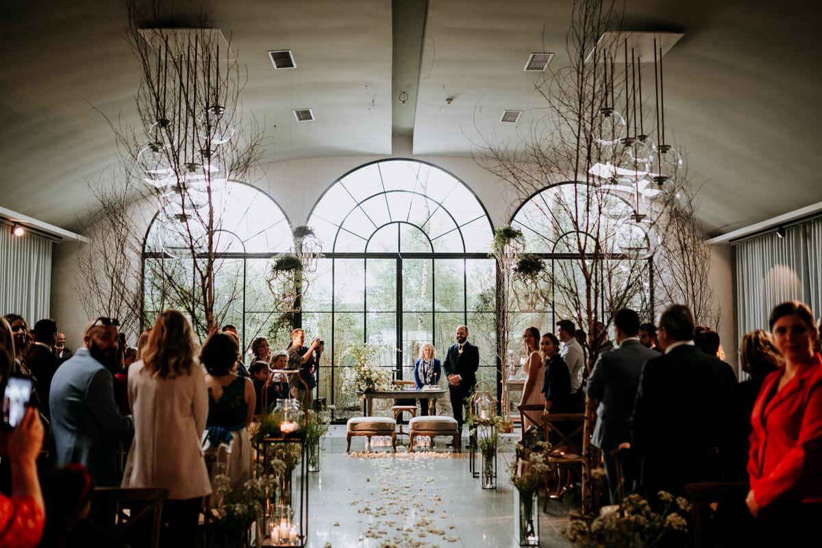 Até nós, fotógrafos e videógrafos de casamento, ficamos boquiabertos com a beleza da decoração daquele espaço, criada unicamente para a celebração do casamento.