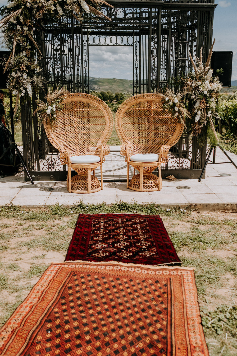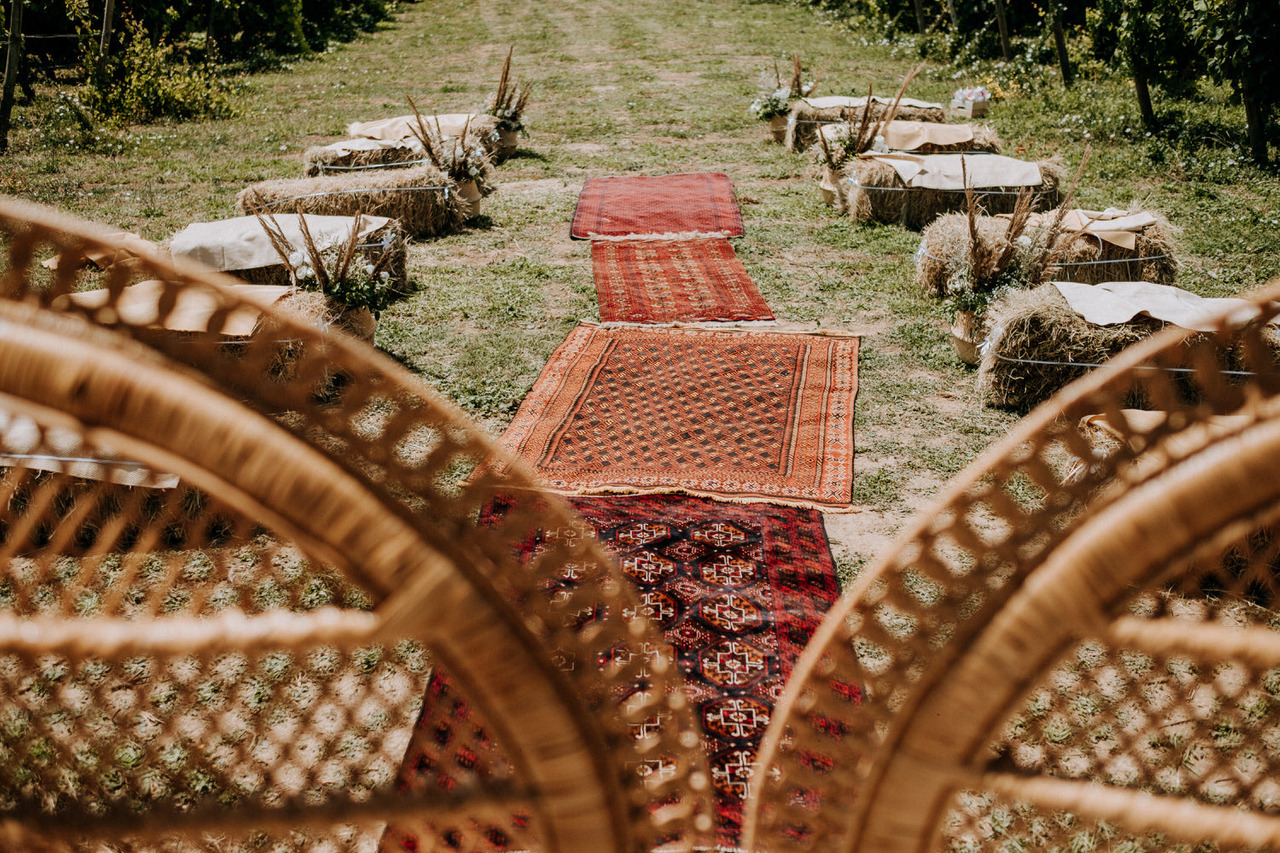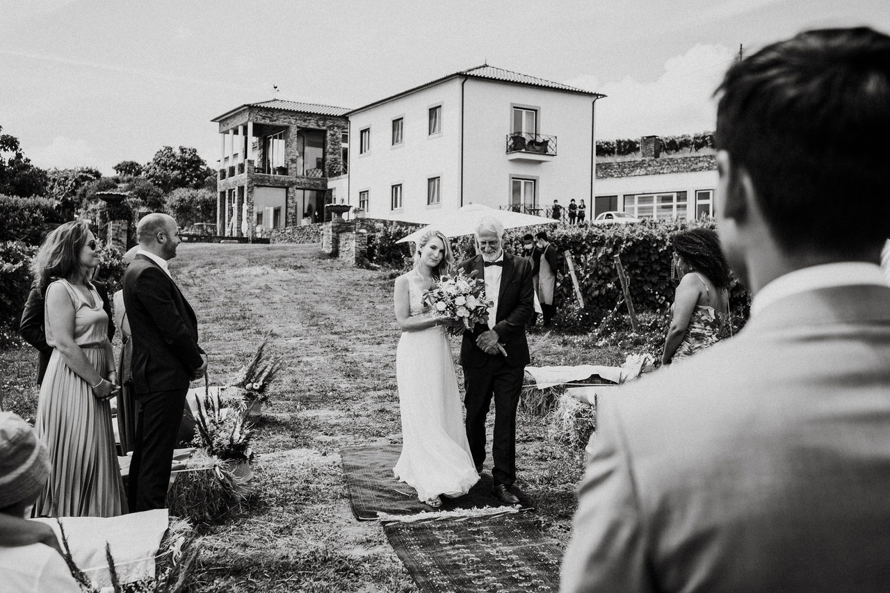 A cerimónia foi no espaço exterior na envolvência das vinhas que contou com toda a decoração da Romã Eventos com os fardos de palha e os tapetes tão característicos e rústicos. Como é bastante típico, a cerimónia foi repleta de discursos emotivos e até mesmo engraçados e foi conduzida pelo irmão da noiva.