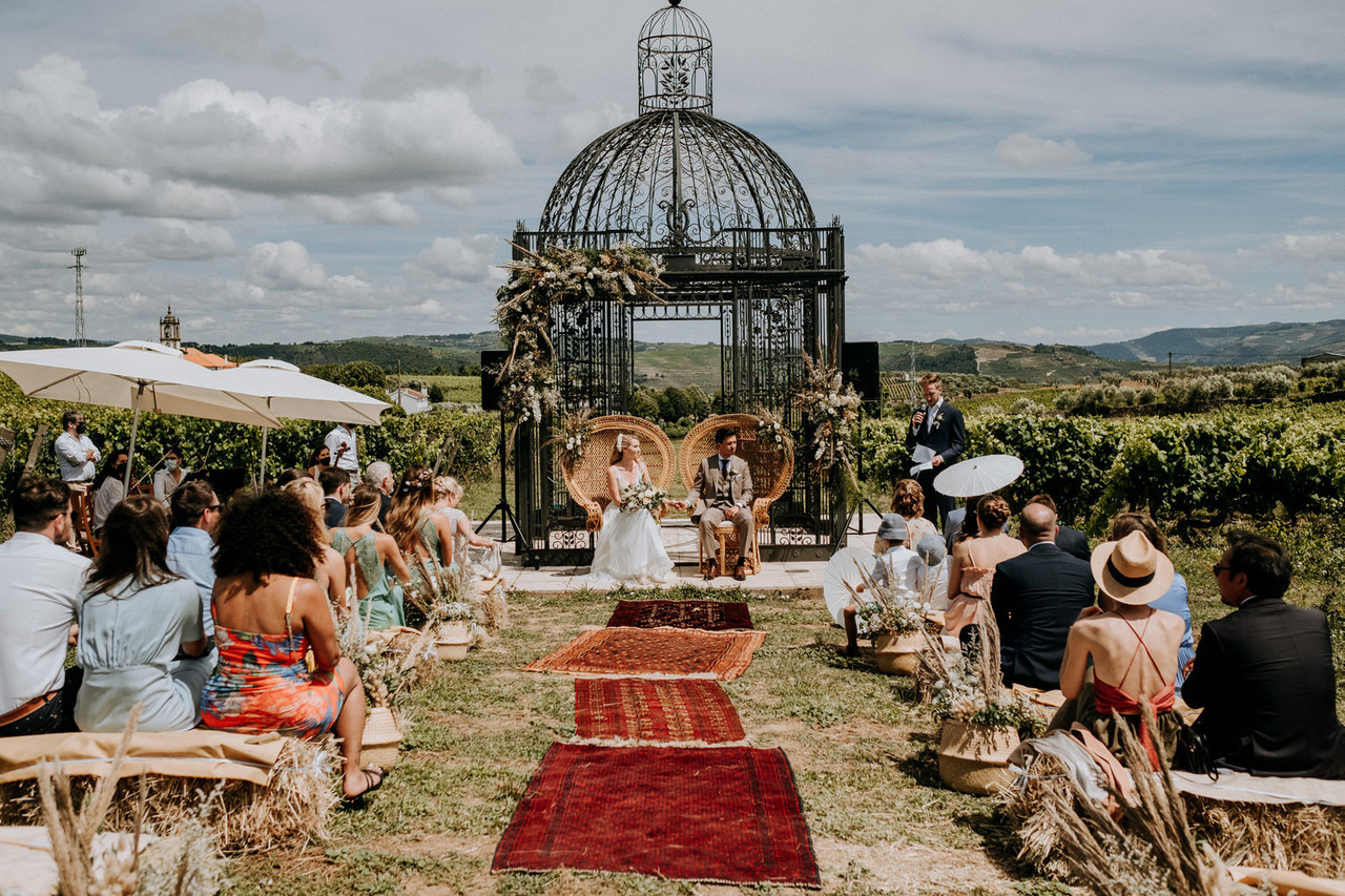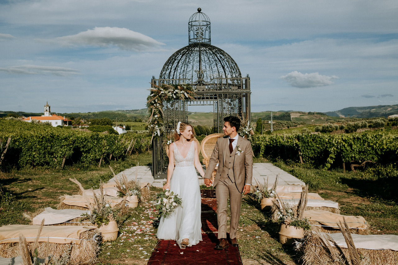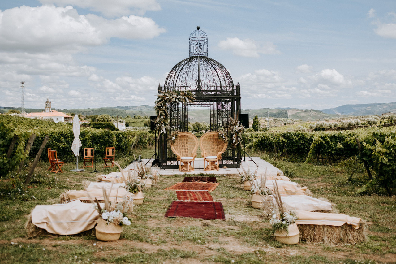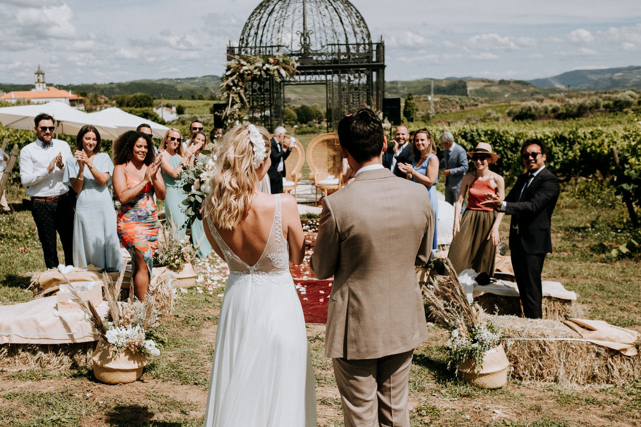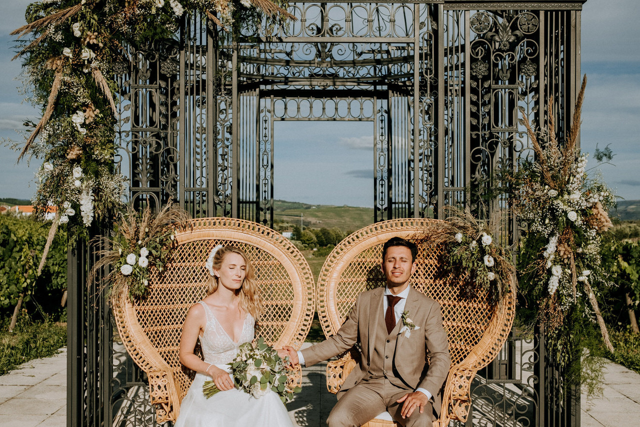 We never get tired of coming back here. If the landscapes are beautiful, the gastronomy is even better! Living in Belgium, this couple chose the Douro region in Portugal for their destination wedding. They brought their family and closest friends to Casa das Pipas at Quinta do Portal to celebrate this important day. The ceremony took place outside, surrounded by the vineyards. All the decor was at the hands of Rute, from Romã Eventos who created a great set with straw bales and rustic carpets.