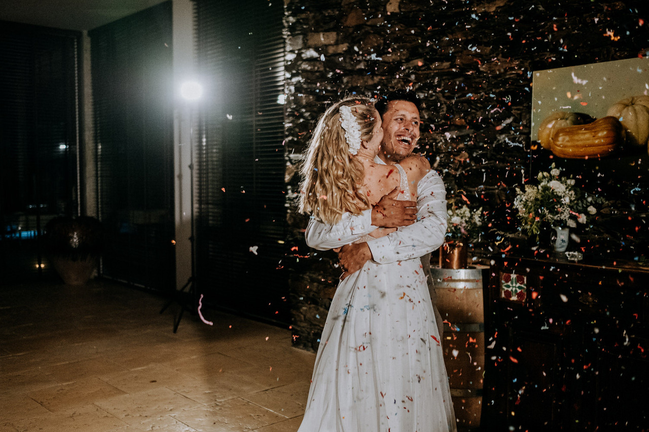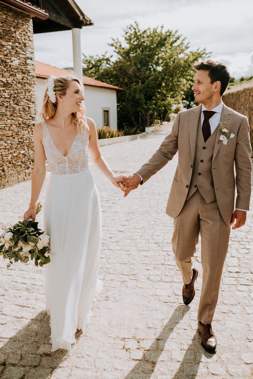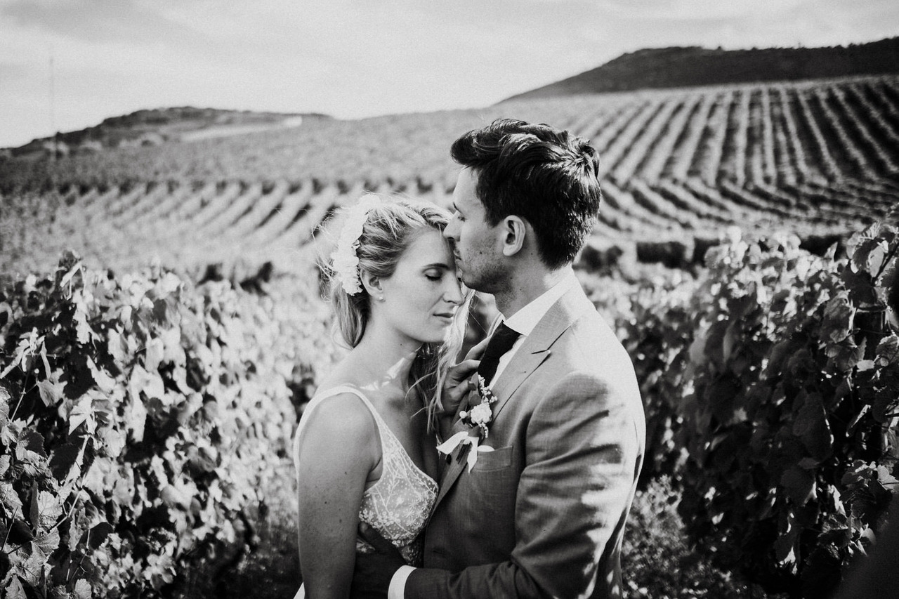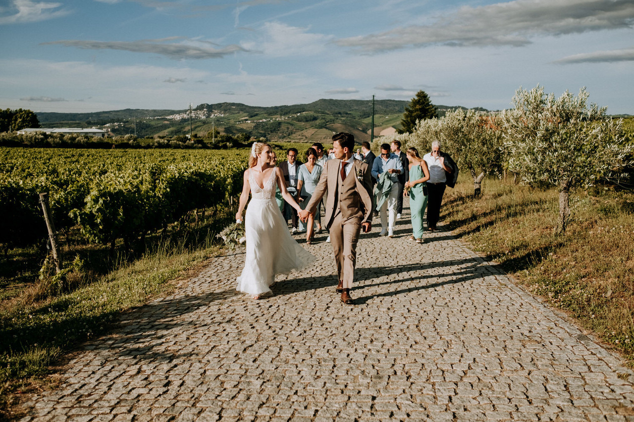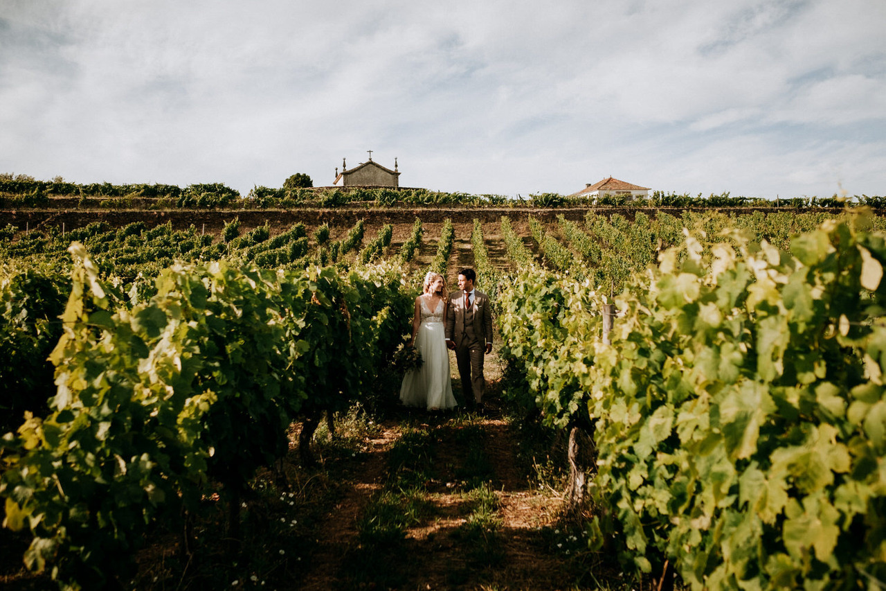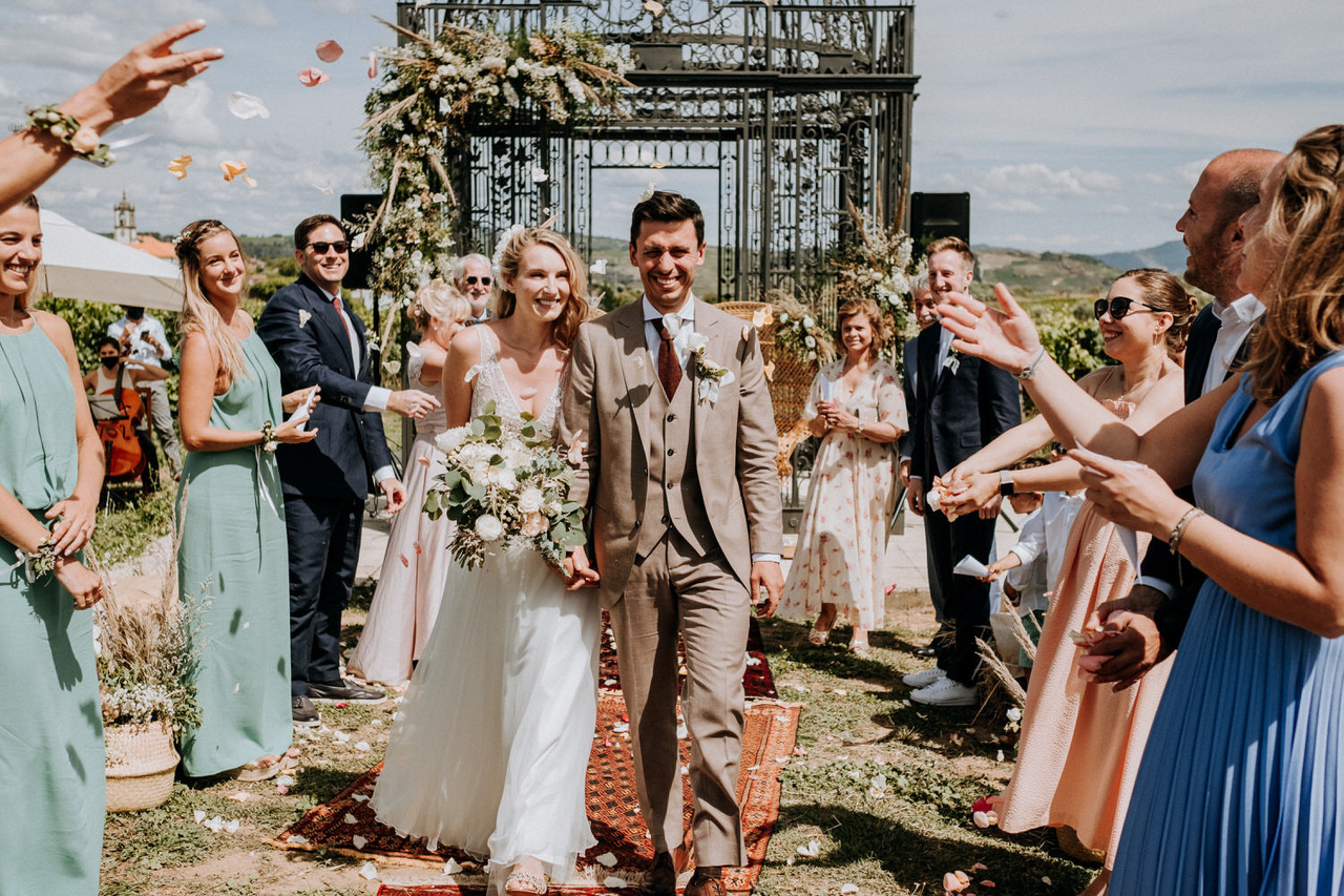We never get tired of coming back here. If the landscapes are beautiful, the gastronomy is even better! Living in Belgium, this couple chose the Douro region in Portugal for their destination wedding. They brought their family and closest friends to Casa das Pipas at Quinta do Portal to celebrate this important day. The ceremony took place outside, surrounded by the vineyards. All the decor was at the hands of Rute, from Romã Eventos who created a great set with straw bales and rustic carpets.