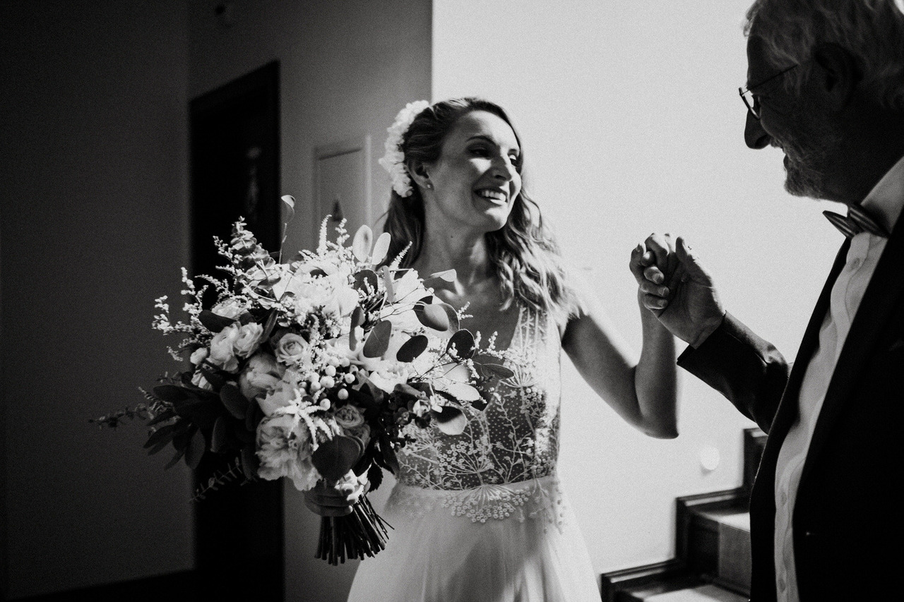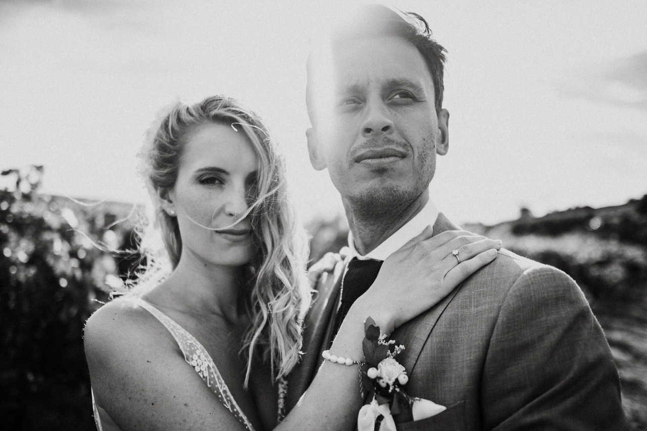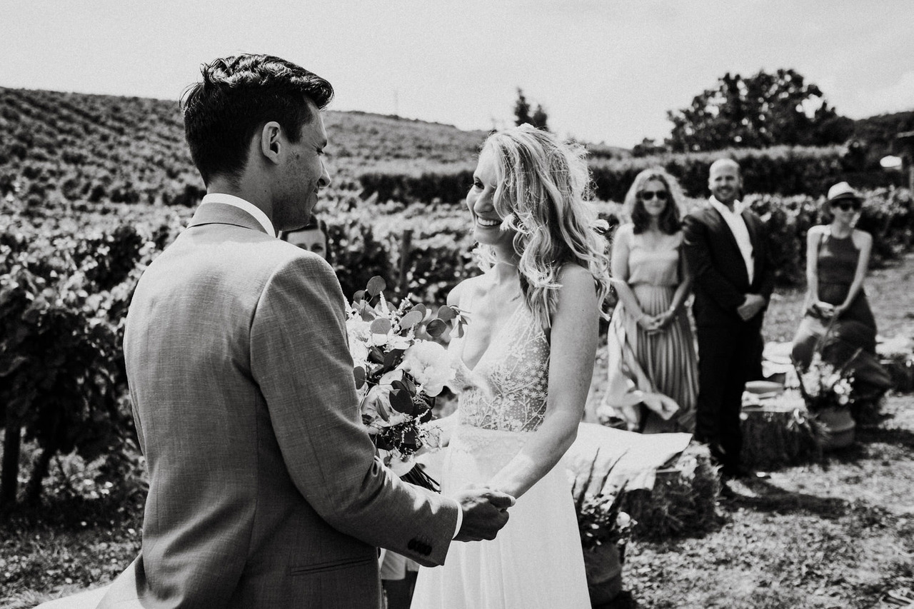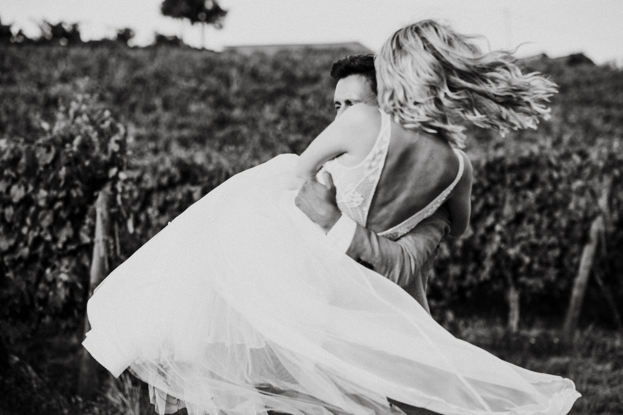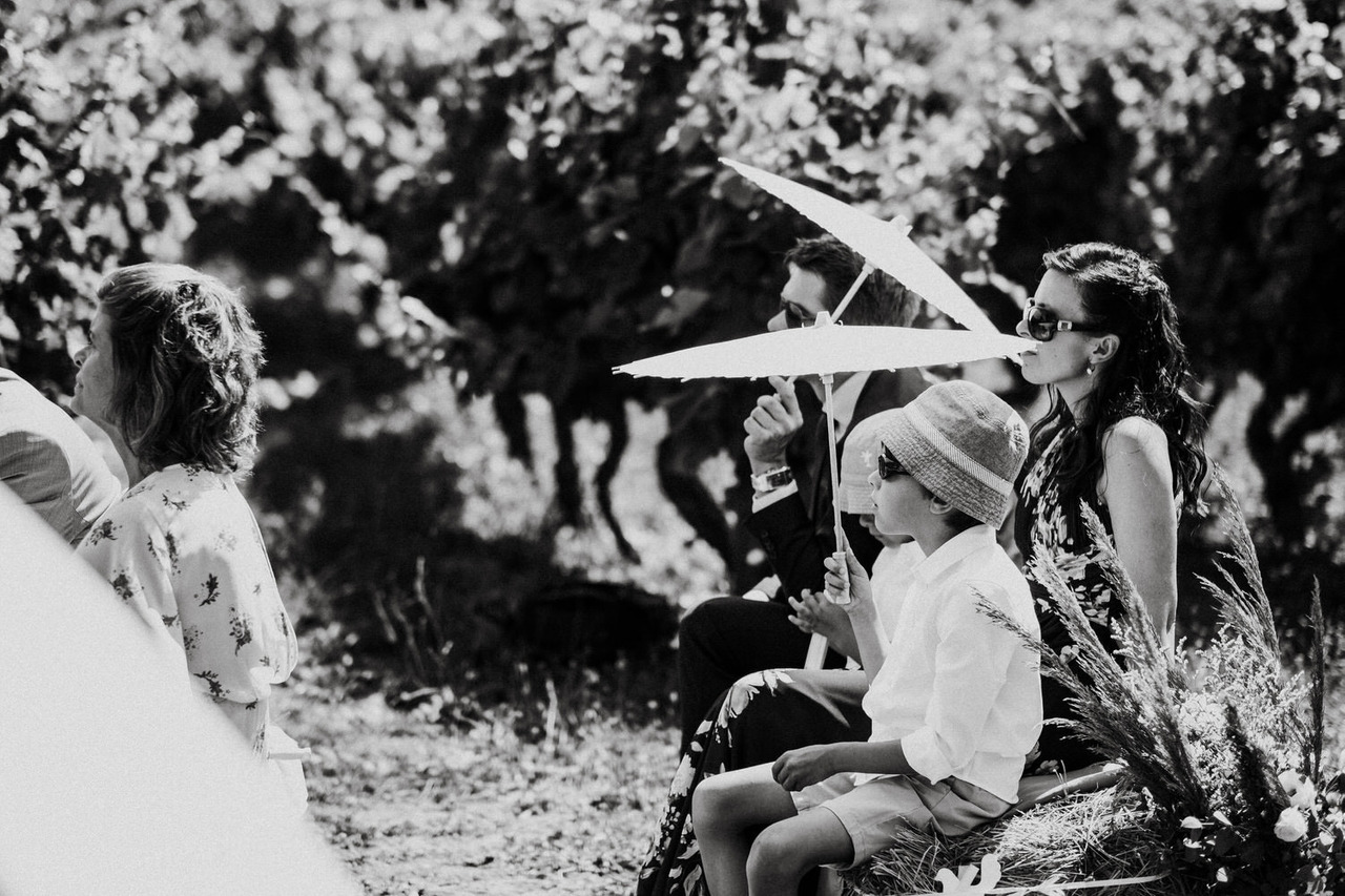 We never get tired of coming back here. If the landscapes are beautiful, the gastronomy is even better! Living in Belgium, this couple chose the Douro region in Portugal for their destination wedding. They brought their family and closest friends to Casa das Pipas at Quinta do Portal to celebrate this important day. The ceremony took place outside, surrounded by the vineyards. All the decor was at the hands of Rute, from Romã Eventos who created a great set with straw bales and rustic carpets.